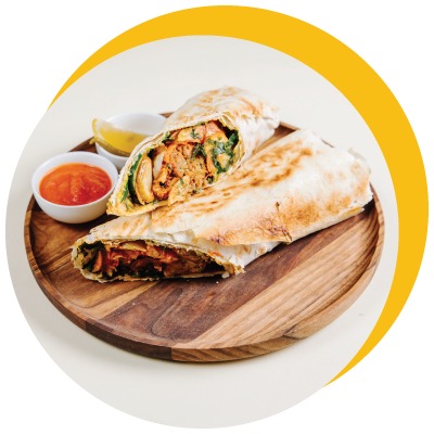 Juicy lamb tikka cooked in Turkish spices, in a wrap with your choice of salad and sauce.