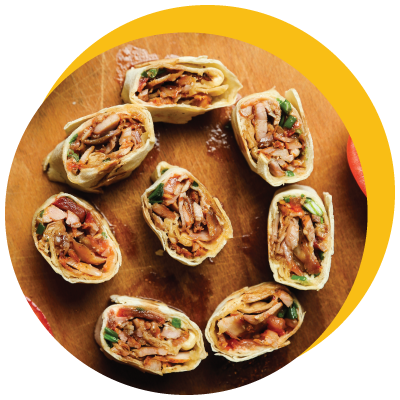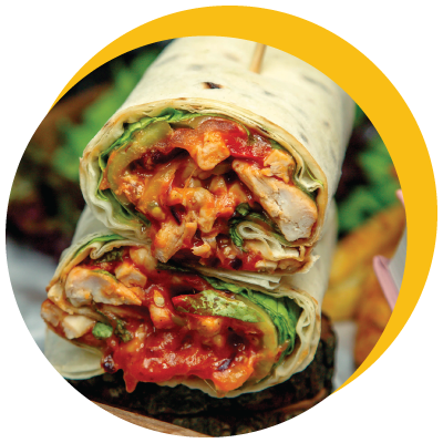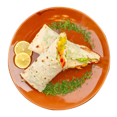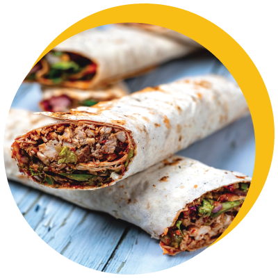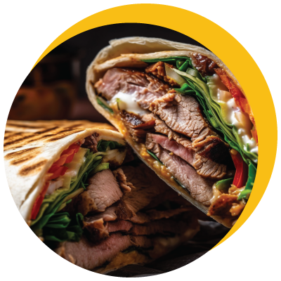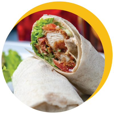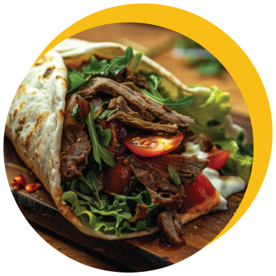 Tender chicken Shawarma, slow-roasted, wrapped in warm pita with fresh salad and your choice of sauce.