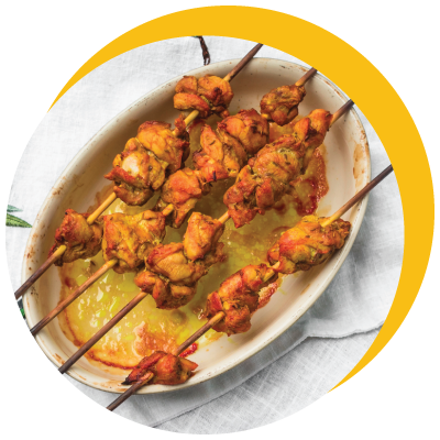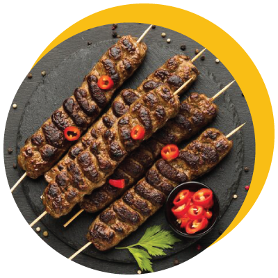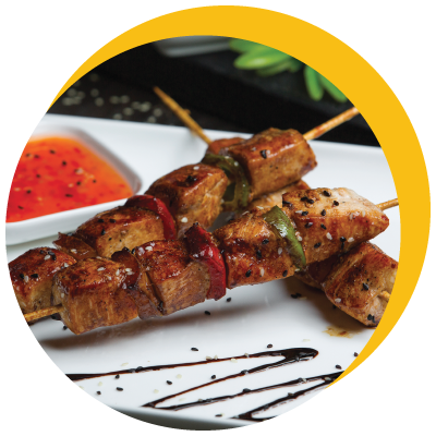 Charcoal-grilled chicken skewers in a wrap with your choice of salad and sauce