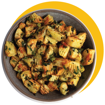 Fried potatoes tossed with garlic, chili, mixed peppers, & fresh coriander.